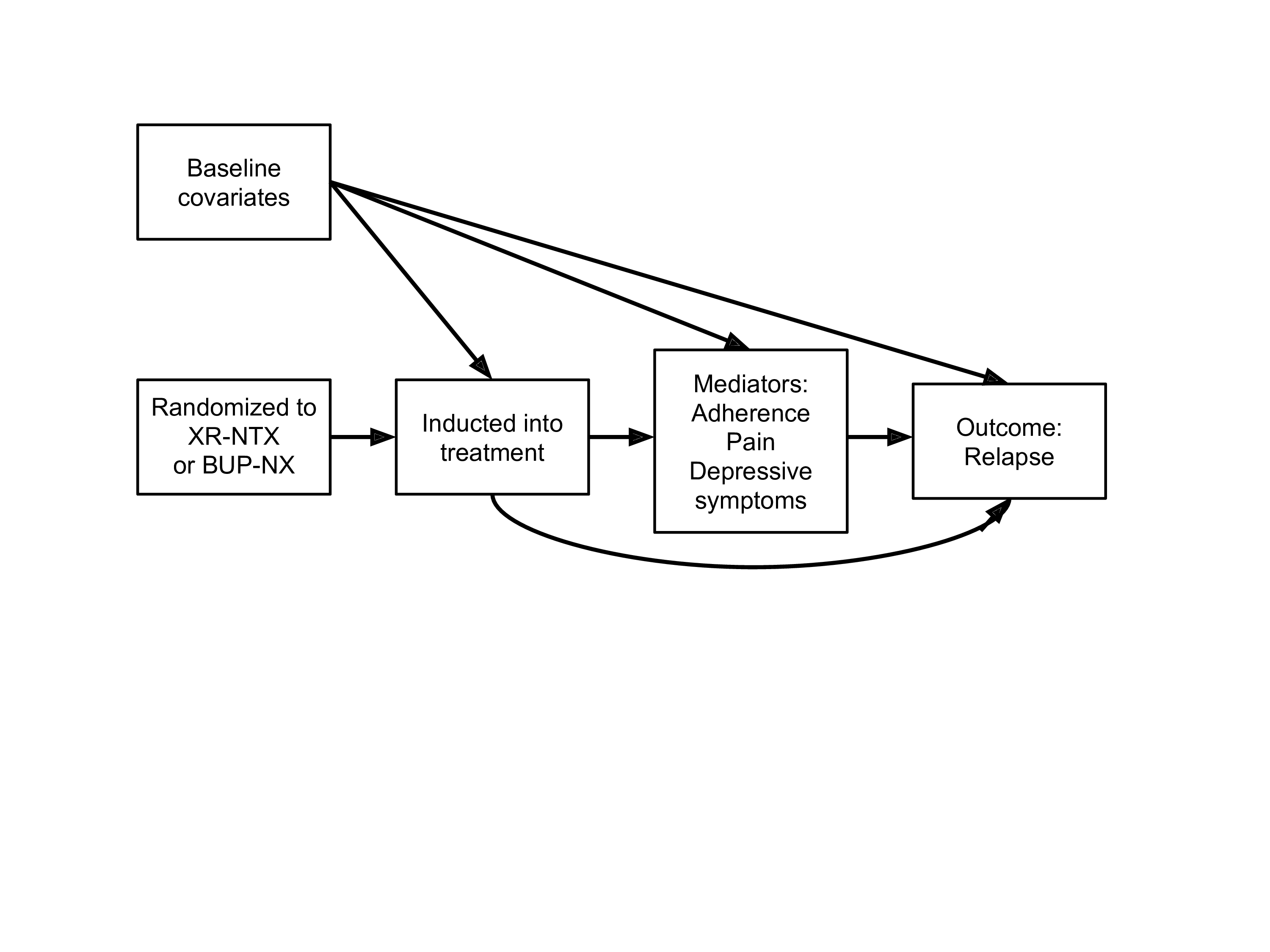 - Do differences in the effects of treatment (comparing two medications for opioid use disorder, naltrexone vs buprenorphine) on risk of relapse operate through mediators of adherence, opioid use, pain, and depressive symptoms? (Rudolph et al., 2020)
